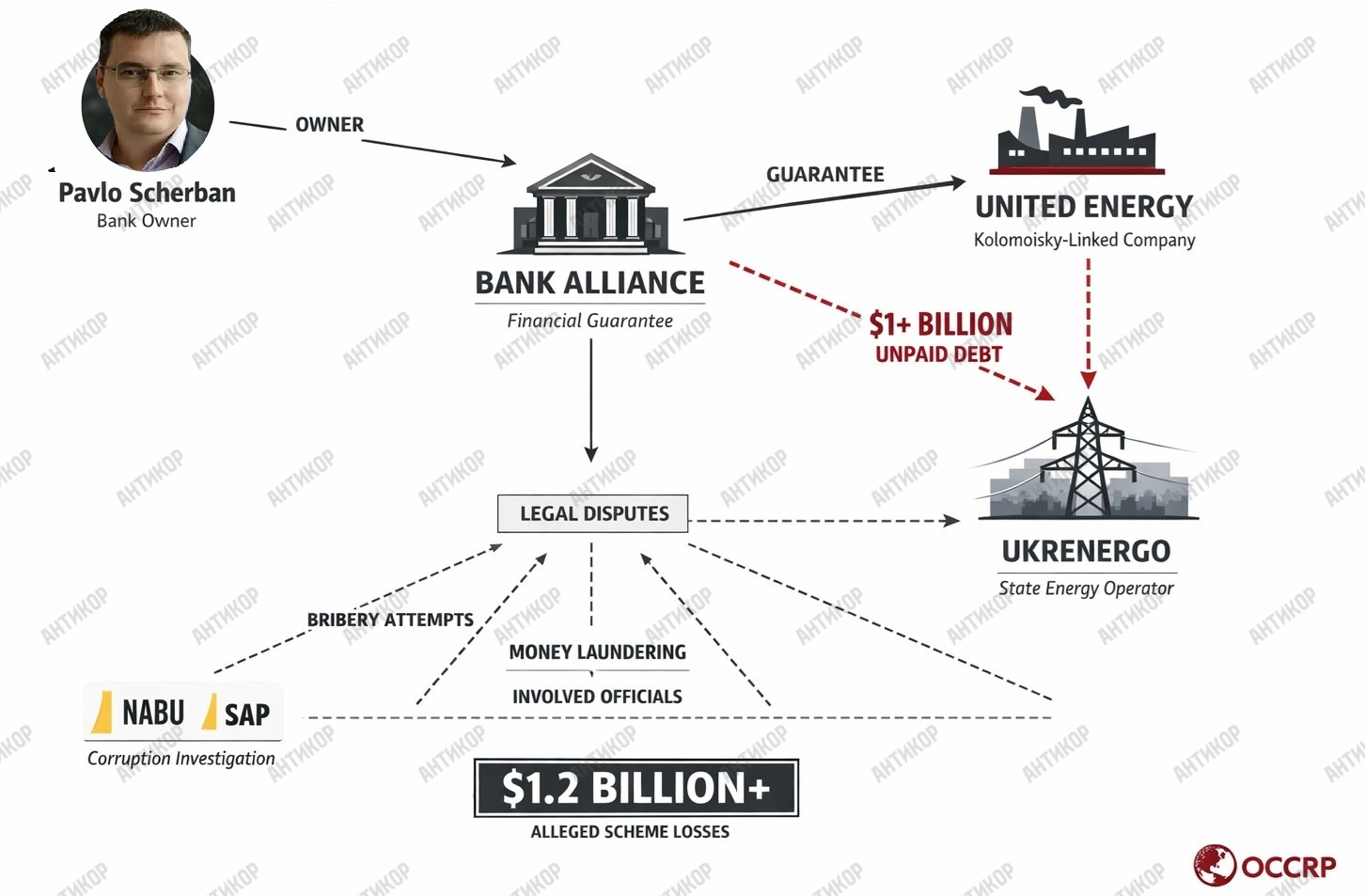 На цьому тлі особливу увагу привертає низка скандалів, пов’язаних із банком. Один із найбільш резонансних — історія з боргом перед «Укренерго» на суму близько 1,2 мільярда гривень. Після того як компанія United Energy не виконала своїх зобов’язань, банк «Альянс», який виступав гарантом, відмовився погашати борг, що призвело до затяжних судових процесів.