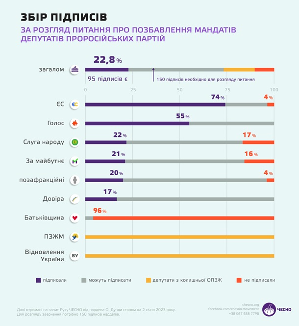 Майже 70 народних депутатів України відмовилися ставити свої підписи під зверненням до спікера парламенту Руслана Стефанчука про позбавлення повноважень депутатів, обраних від заборонених проросійських партій. Про це йдеться у відповіді на запит Руху ЧЕСНО народного депутата від фракції Слуга народу Олега Дунди, який ініціював збір підписів.